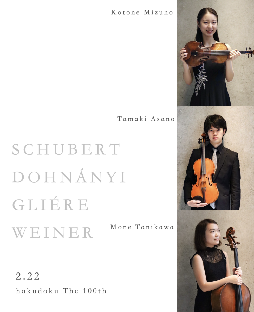 今回は、若きシューベルトが幸福な調性で書きはじめ、第2楽章の途中で途切れた未完の断章、端正な陰影を湛えたヴェイネルと洗練された独自の声をもつドホナーニというハンガリーの風土が育んだふたつの感性、そして互いの輪郭を確かめ合うように綴られるグリエールの各作品をお送りいたします。